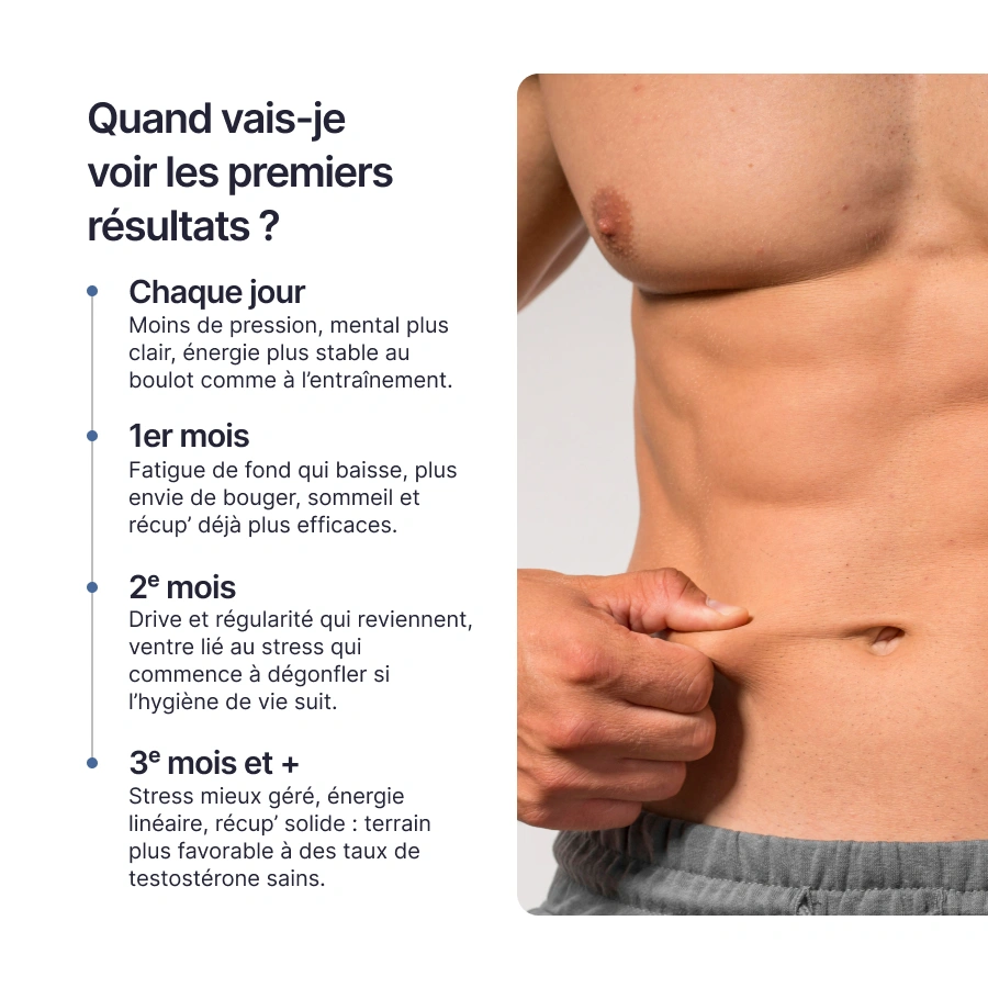 Le soutien naturel pour les hommes soumis au stress qui veulent préserver leur testostérone, leur énergie et leurs performances, sans hormones ni produits dopants.